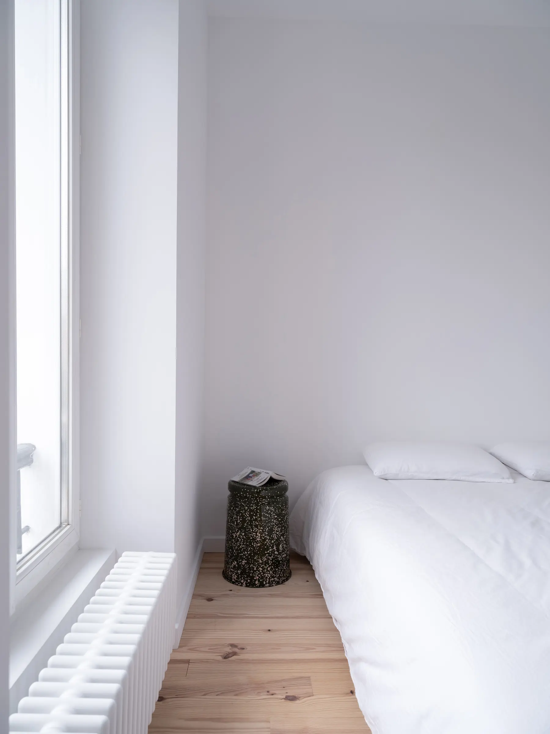 Les deux chambres, aux proportions identiques, sont séparées par une paroi épaisse intégrant des rangements toute hauteur de part et d’autre, ainsi que le dégagement qui permet d’y accéder. Ce passage est souligné au sol par une dalle de marbre vert, qui en matérialise le seuil.