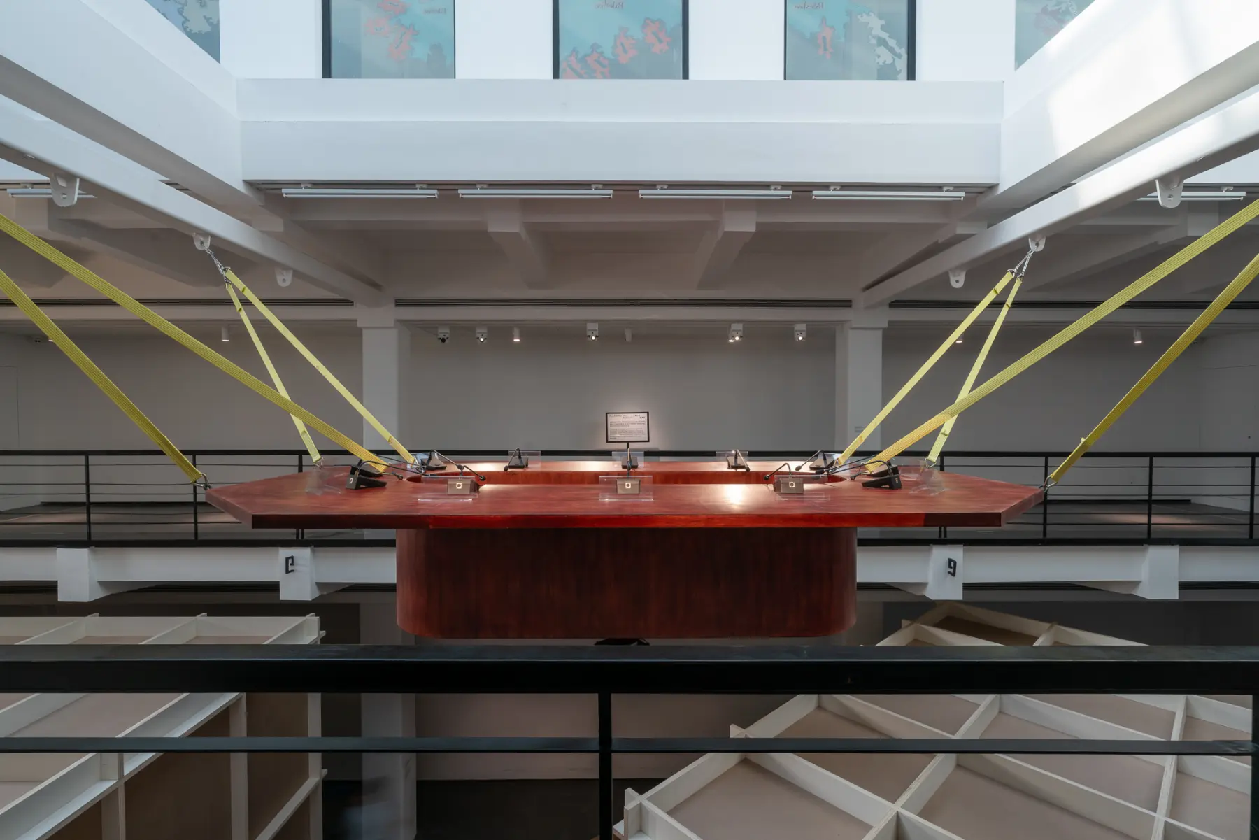 Pour la première exposition monographique d’Ash Moniz en Asie, Roll conçoit un parcours qui se déploie sur trois étages du musée, explorant les lacunes, les silences et les absences au sein des chaînes d’approvisionnement mondiales, ces moments où le pouvoir vacille et où surgit la solidarité. Au quatrième étage, des œuvres vidéo, sculpturales et cartographiques examinent les dispositifs de contrôle du travail et de prévention des pertes. Les vidéos sont présentées dans des boîtes noires évoquant des conteneurs maritimes, faisant allusion à la logistique mondiale. Le cinquième étage accueille une grande table suspendue, inspirée de celles utilisées lors des sommets politiques : elle met en scène une « conférence des sans-voix », où le silence devient un acte de défi. Au sixième étage, l’atrium de la bibliothèque accueille une installation cartographique qui trace les alliances entre ports éloignés, redéfinissant la proximité à partir de conditions partagées de travail et de solidarité.